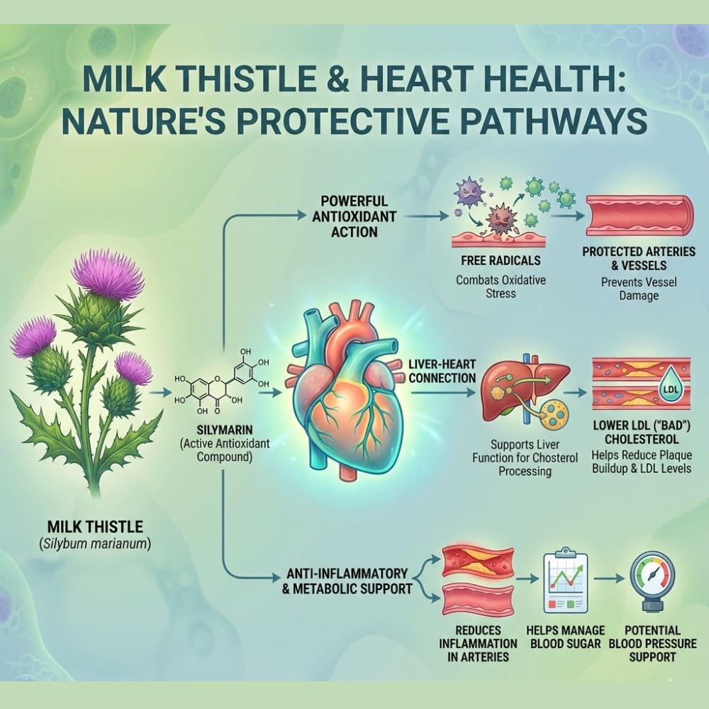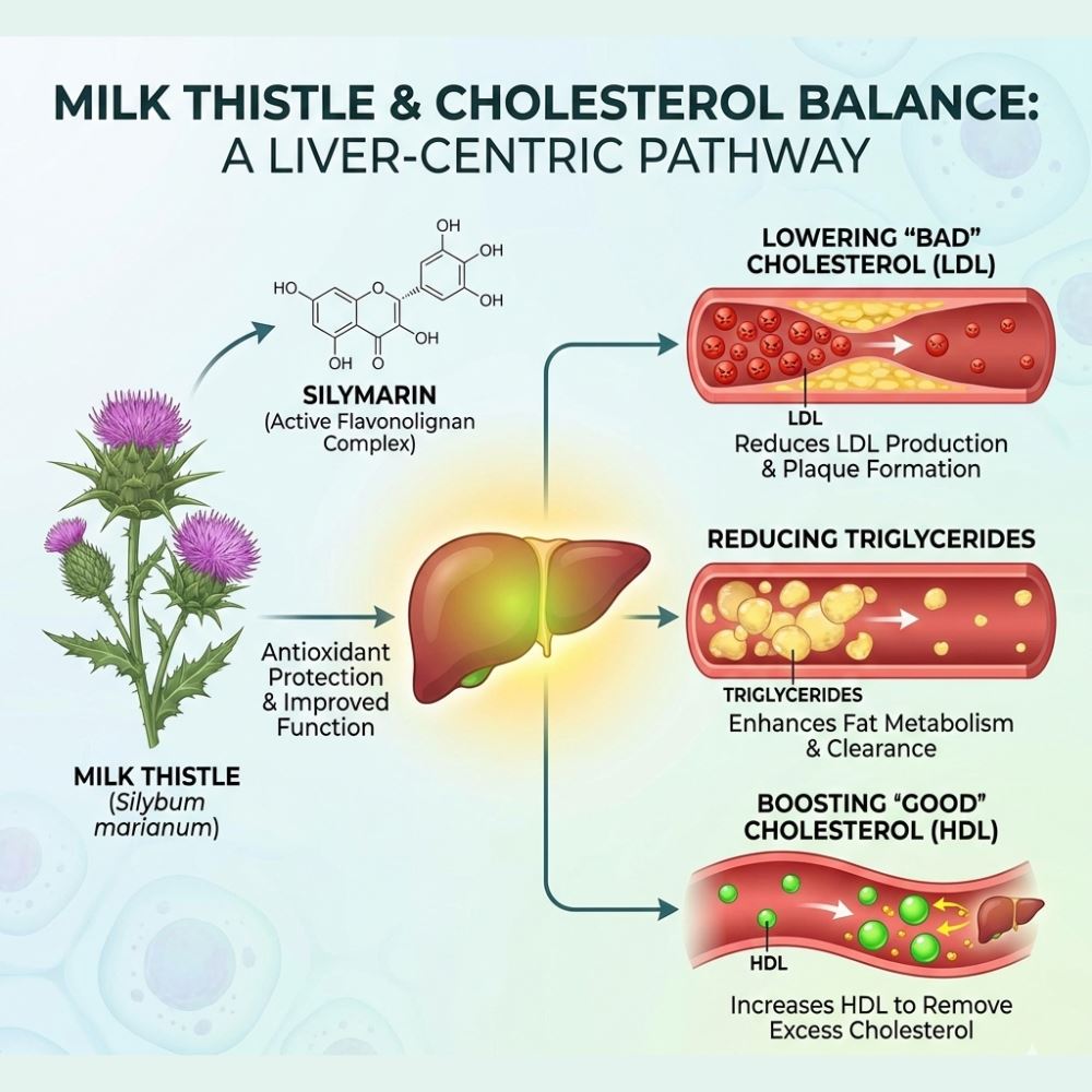 Milk Thistle is extensively studied for its influence on lipid metabolism and oxidative stress. Research literature describes silymarin as a potent antioxidant that supports liver-mediated cholesterol regulation. Since cholesterol synthesis and clearance are closely linked to liver function, maintaining hepatic efficiency plays an indirect yet critical role in cardiovascular balance.