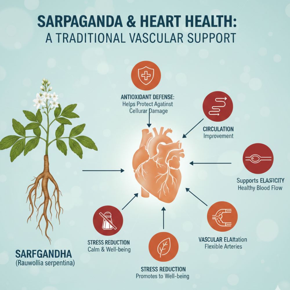 Sarpagandha has been extensively documented in traditional Indian systems for its role in regulating vascular tone and nervous system balance. Scientific literature has historically explored its influence on blood pressure modulation through autonomic pathways.
