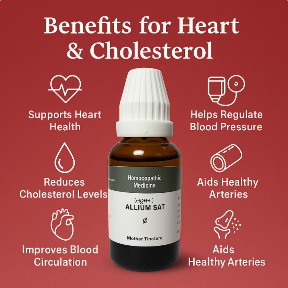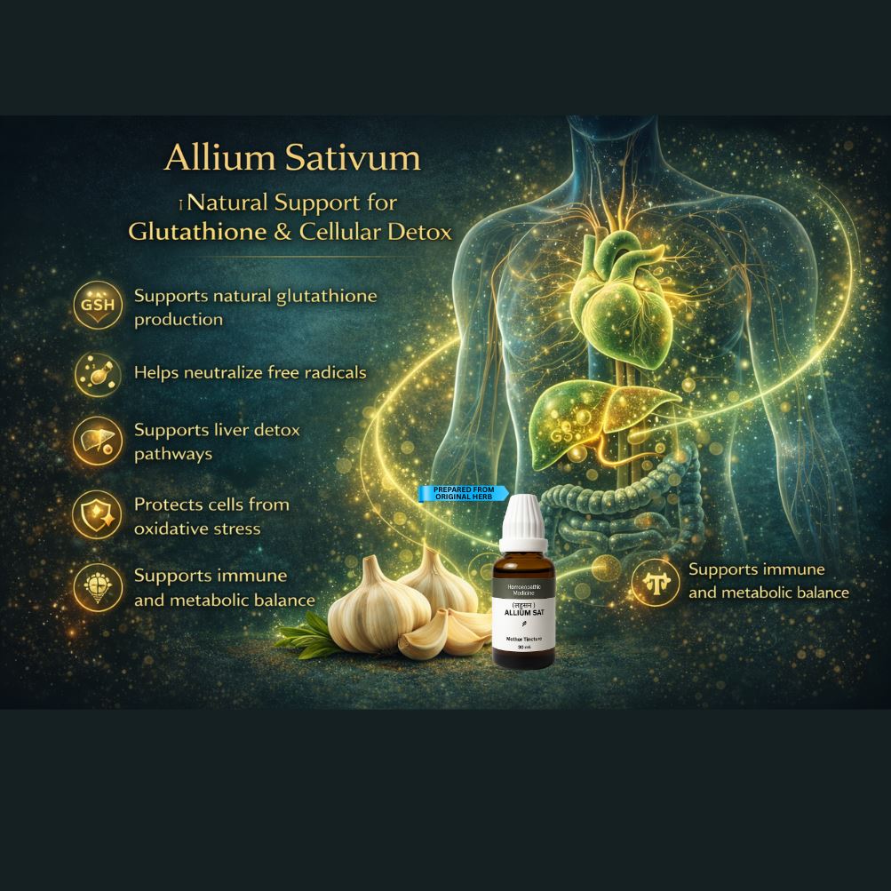 Allium Sat Mother Tincture ek high-potency herbal extract hai jisme bioactive sulfur compounds, natural antioxidants, flavonoids, glutathione-boosting elements & nitric-oxide supportive components hotey hain.