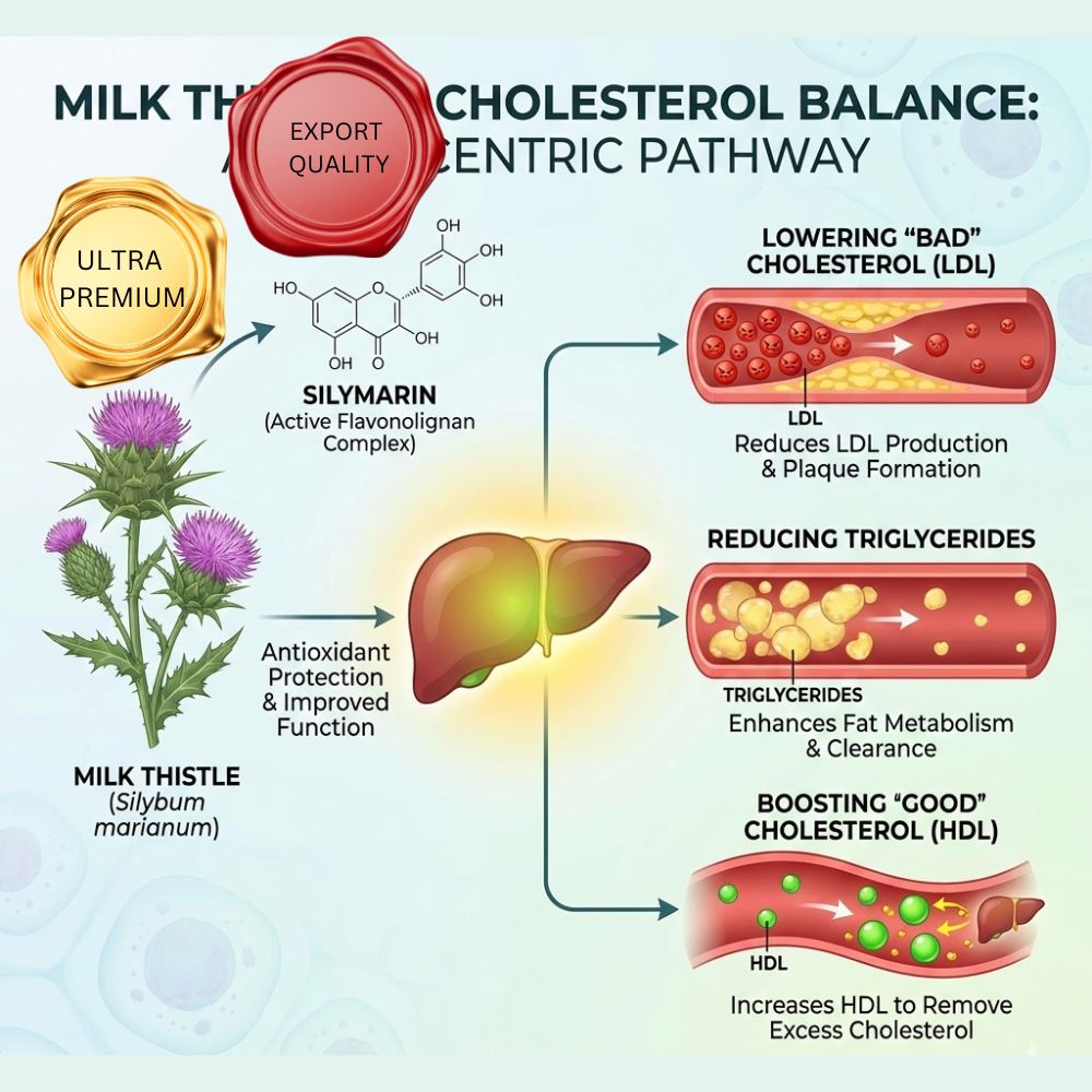 Milk Thistle remains a foundational component due to its extensively studied relationship with lipid metabolism, oxidative balance, and hepatic support. Scientific literature frequently highlights the liver’s role in cholesterol synthesis and clearance, making hepatic efficiency a critical indirect factor in cardiovascular health.