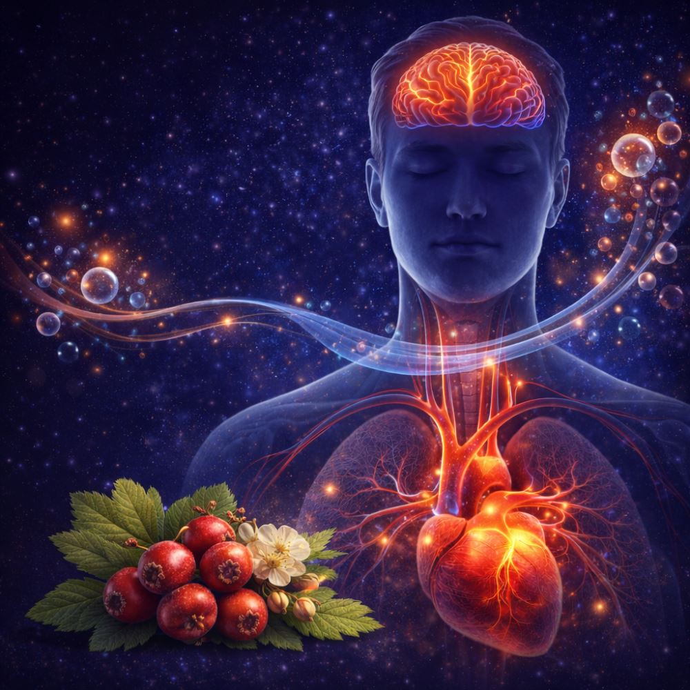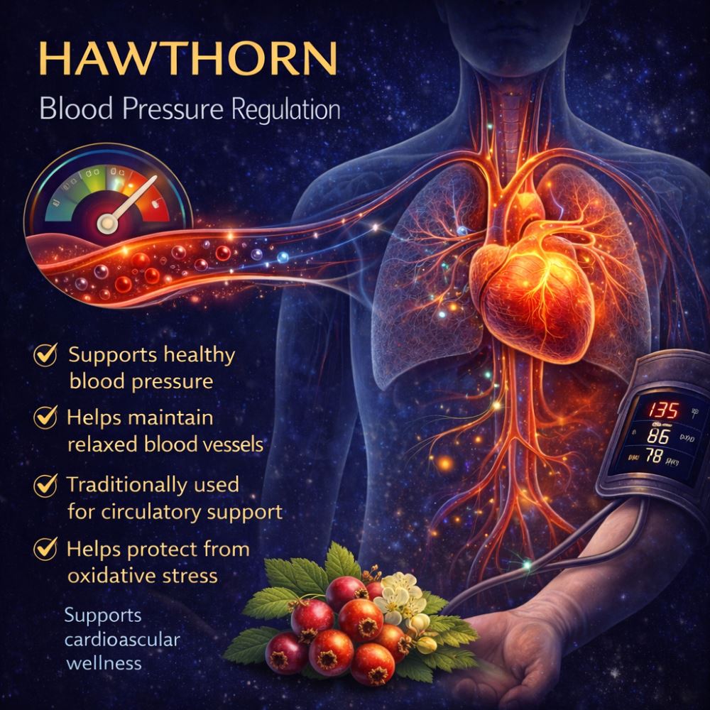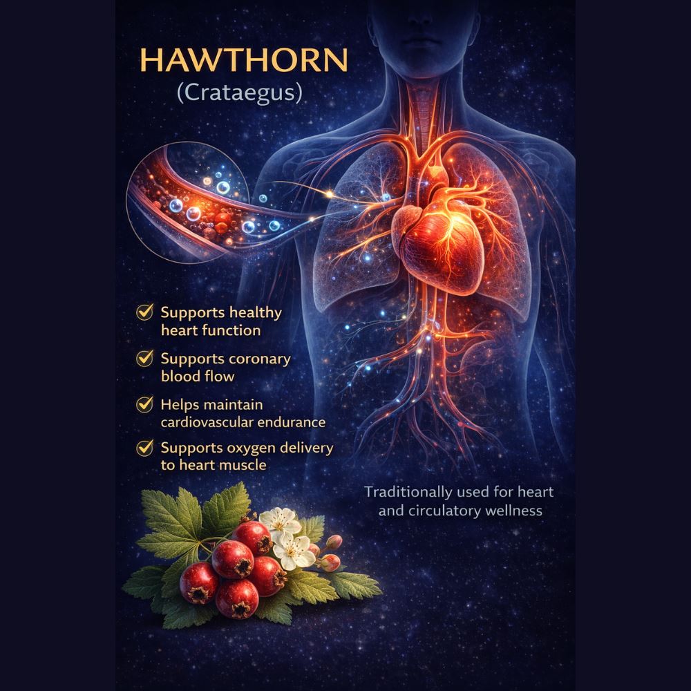 Hawthorn is most widely known for its cardiovascular-supporting properties. It has traditionally been used to help maintain healthy heart muscle function and support efficient circulation. The flavonoids in Hawthorn may help improve oxygen utilization by heart tissues and support overall cardiac efficiency.