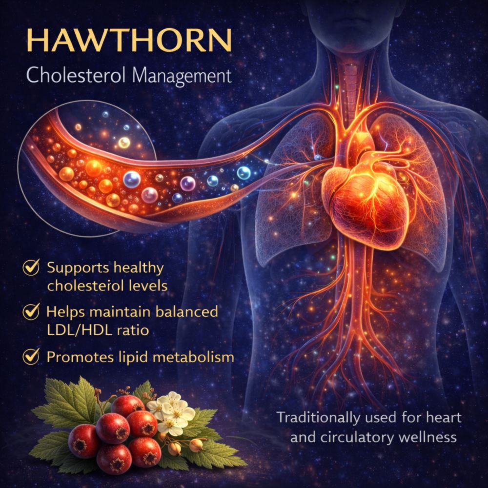 Hawthorn’s antioxidant flavonoids may help support healthy cholesterol metabolism, including maintaining a healthy balance between LDL (“bad”) and HDL (“good”) cholesterol. This contributes to overall cardiovascular wellness.