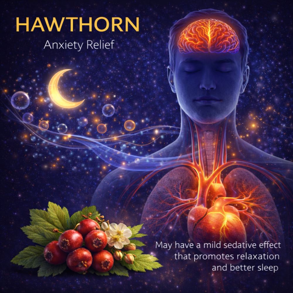 Hawthorn is traditionally described as having a mild calming effect. It may help promote relaxation, reduce nervous tension, and support better sleep quality, particularly when stress is linked with palpitations or restlessness.