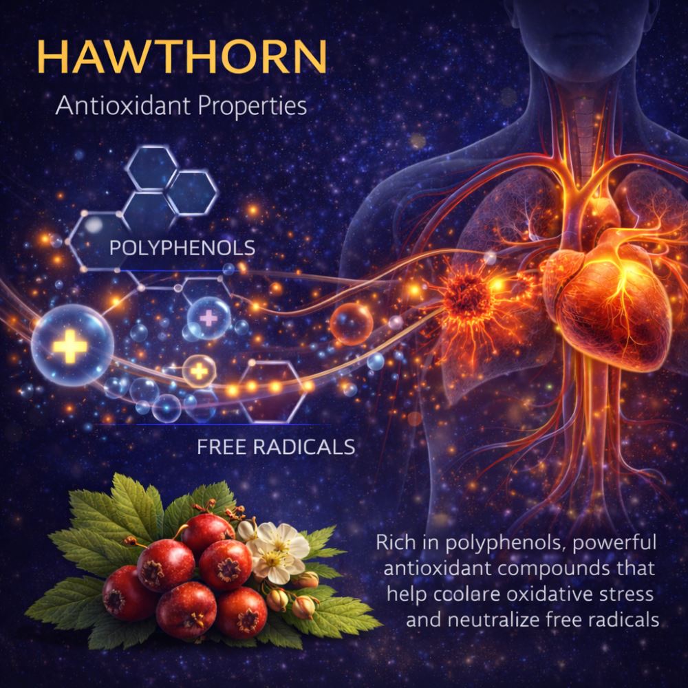 Hawthorn is rich in polyphenols, powerful antioxidants that help neutralize free radicals. This antioxidant activity supports: