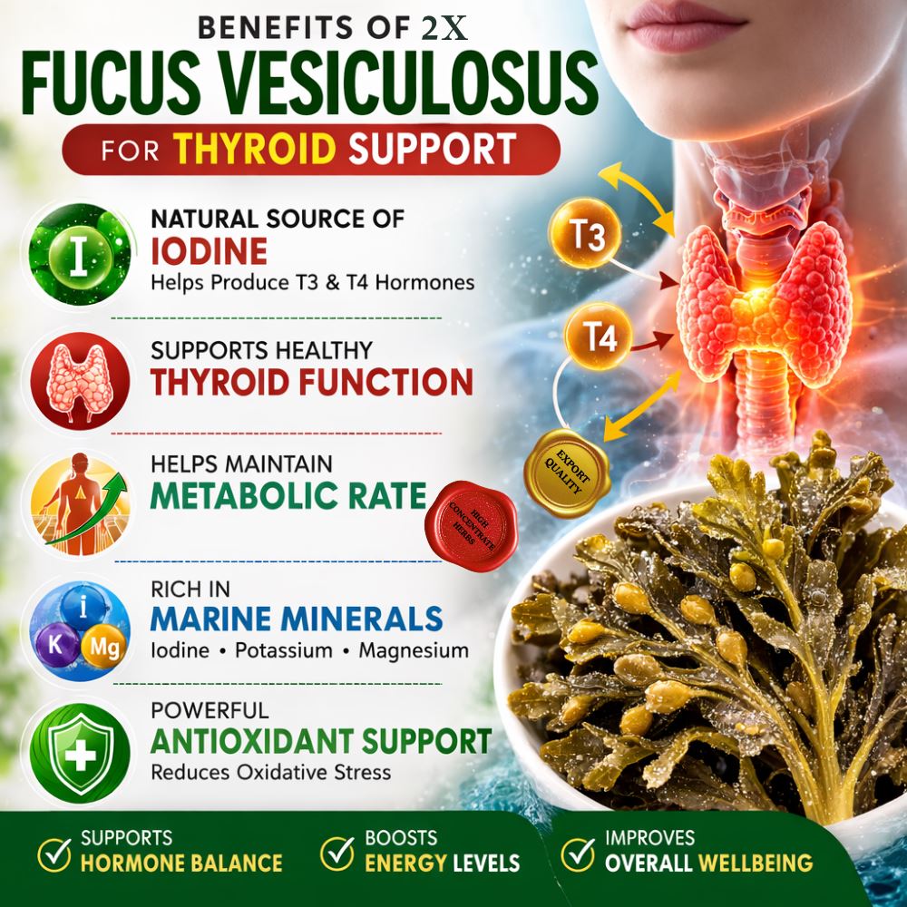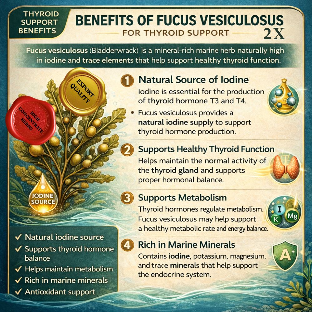 By providing iodine and trace minerals, Fucus vesiculosus may help support metabolic processes associated with thyroid function.