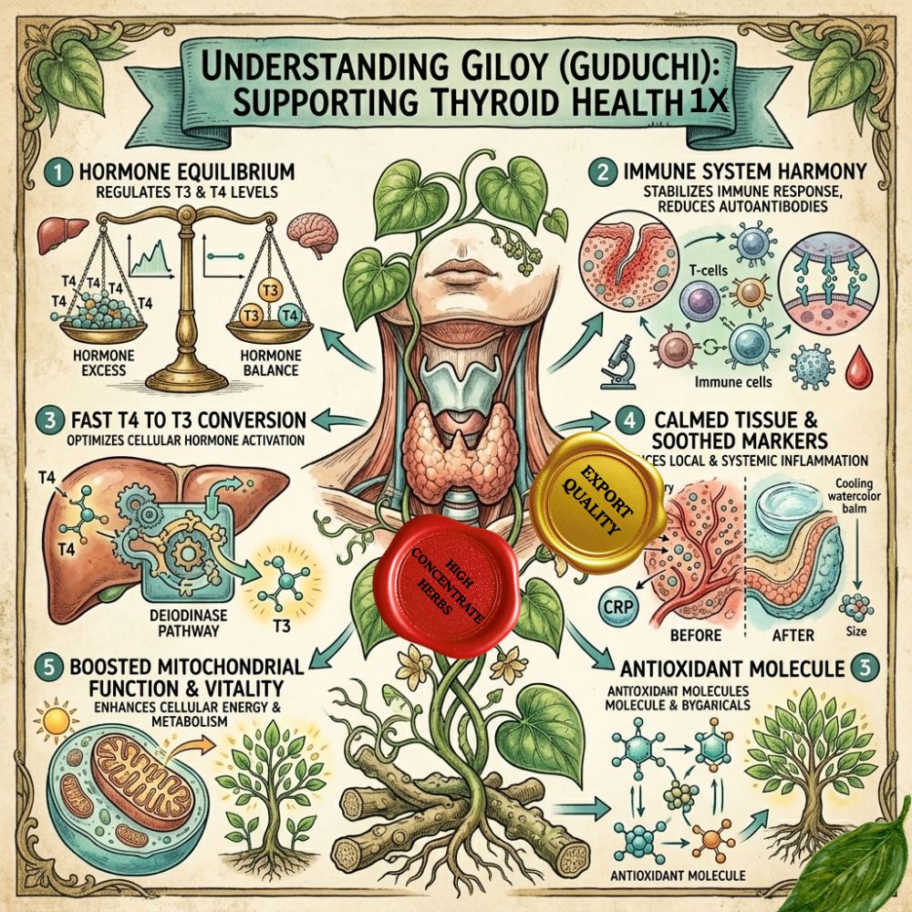 Certain botanical ingredients have been traditionally used and scientifically investigated for their potential roles in supporting metabolic health and endocrine balance. Among these botanicals, Giloy (Tinospora cordifolia), Milk Thistle (Silybum marianum), and Fucus vesiculosus (Bladderwrack) are notable for their phytochemical diversity and supportive properties.