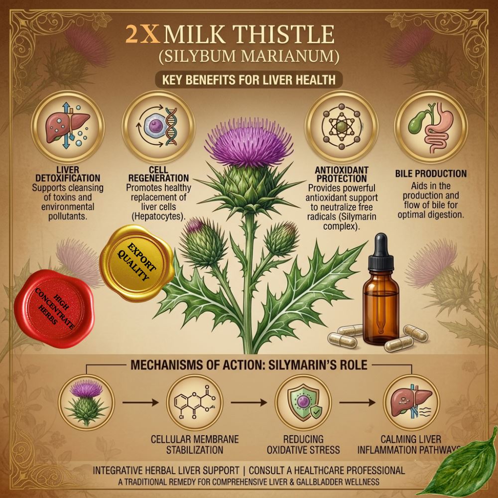 Milk thistle has been studied for its ability to support natural detoxification pathways and protect liver cells from toxic damage.