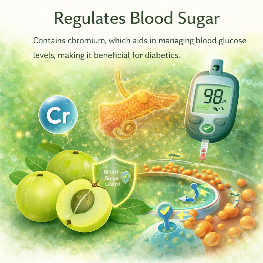 Amalaki contains chromium, which helps regulate insulin function and glucose metabolism.