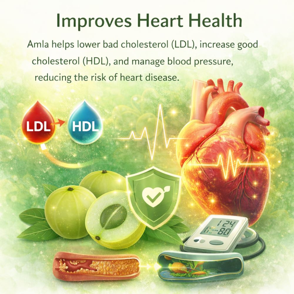 Amalaki supports cardiovascular health by improving lipid profile and reducing oxidative stress.
