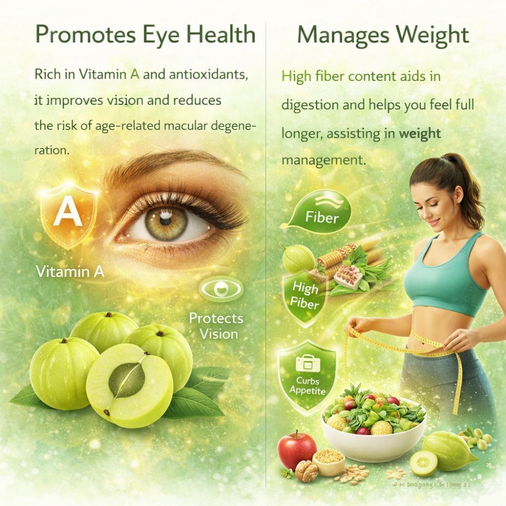 Rich in Vitamin A and antioxidants, Amla supports vision and eye protection.