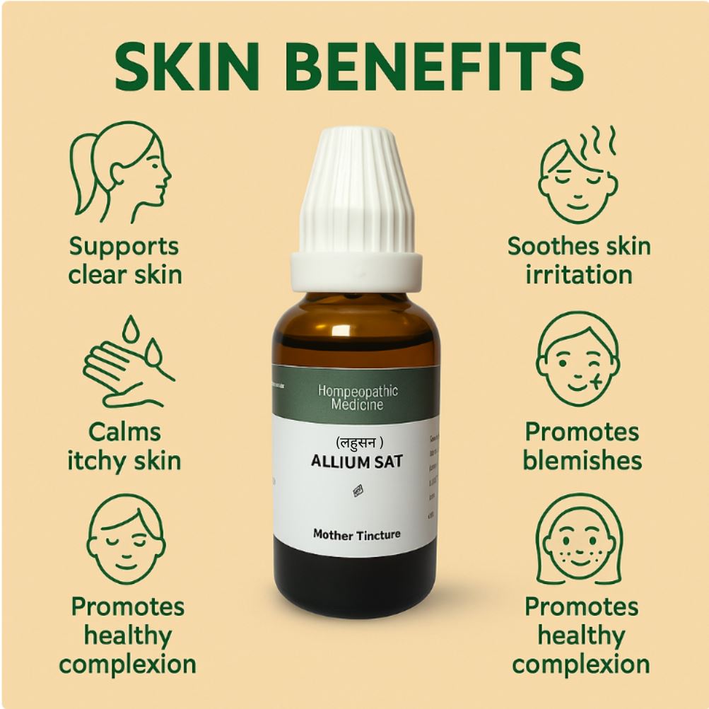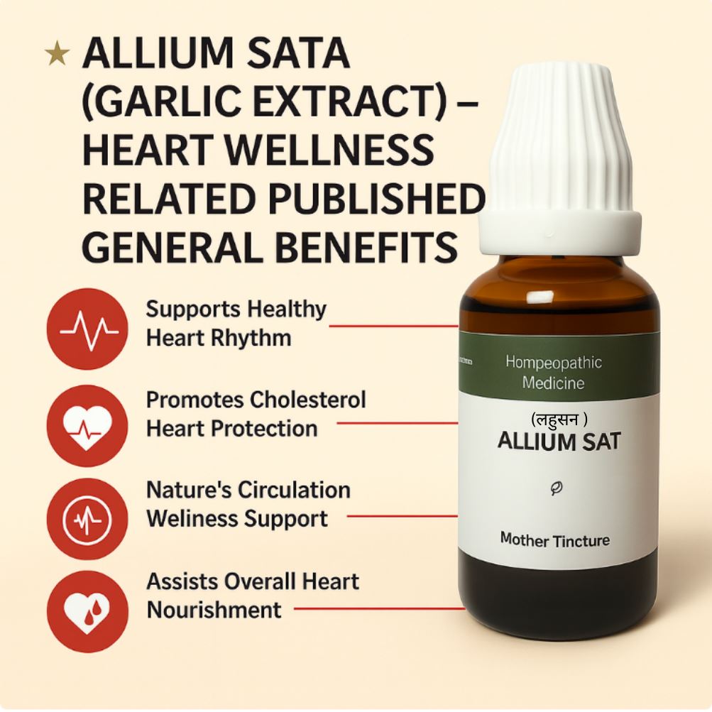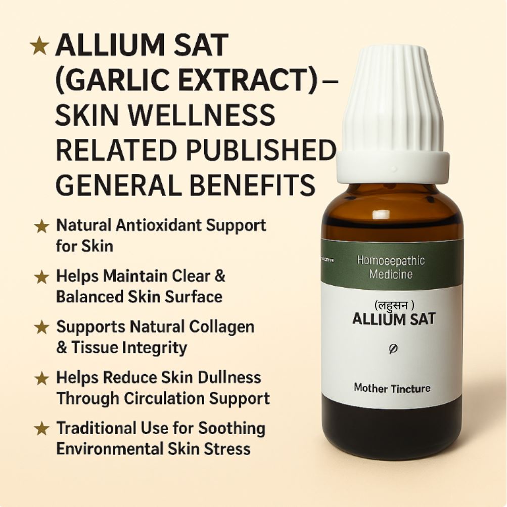 Allium Sat Mother Tincture ek high-potency herbal extract hai jisme bioactive sulfur compounds, natural antioxidants, flavonoids, glutathione-boosting elements & nitric-oxide supportive components hotey hain.