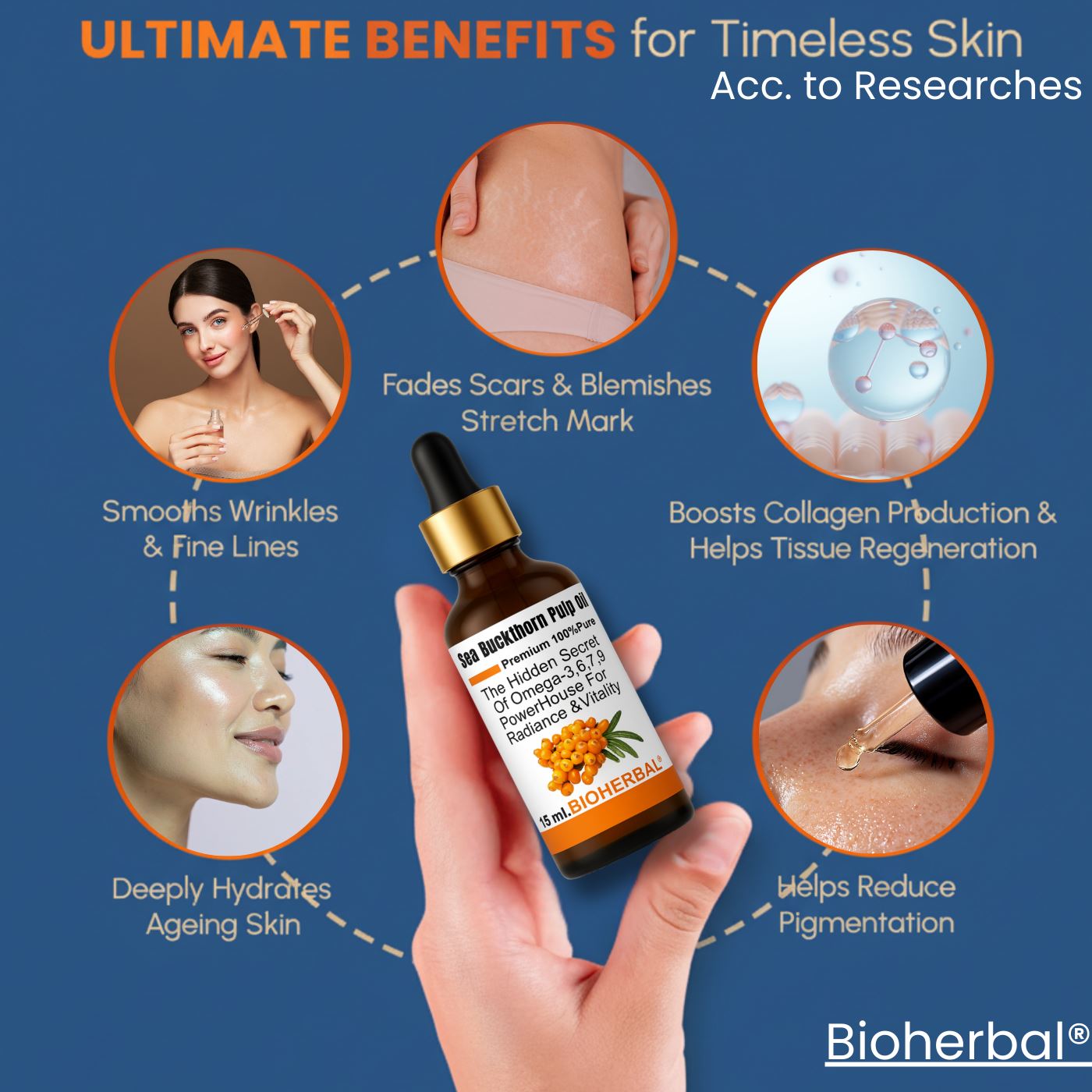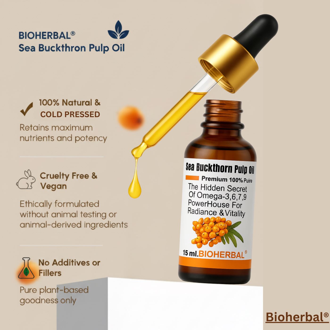 BioHerbal Sea Buckthorn Oil is a cold-pressed, nutrient-rich botanical oil naturally abundant in vitamins A, C & E, essential fatty acids, and plant antioxidants. The oil’s rich red-orange color reflects its high carotenoid and phytonutrient content. It absorbs quickly into the skin, helping to support natural hydration, smooth texture, and healthy-looking radiance without leaving a greasy residue. According to studies published in the Journal of Applied Cosmetic Science (2018) and Phytotherapy Research (2020), topical use of Sea Buckthorn oil, which contains omega-7 palmitoleic acid and vitamin E, helps improve skin moisture, barrier repair, and overall tone. These findings align with traditional uses of Sea Buckthorn in natural skin-nourishing preparations.Storage: Store in a cool, dry, and dark place. Improper storage may affect the product quality. Keep out of reach of children. This product is not intended to diagnose, treat, cure or prevent any disease. Consult your healthcare professional if you are pregnant, nursing, or taking other supplements.